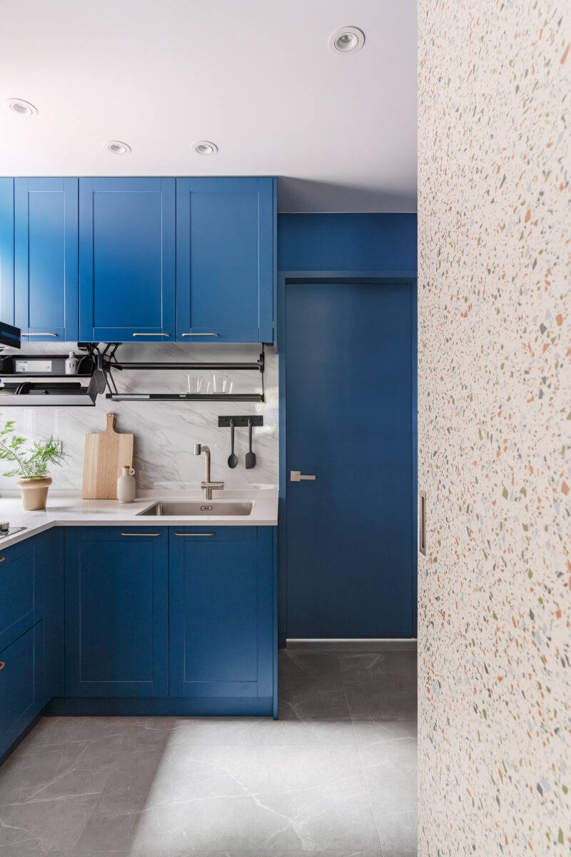 以金色的把手點綴寶藍色烤漆門片成就個性化廚具。