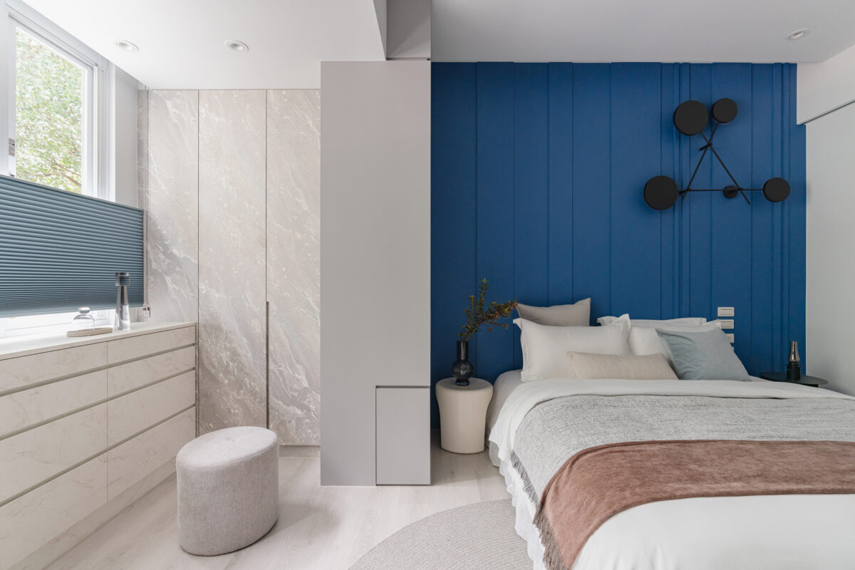 主臥床頭板選用藍色律動造型,