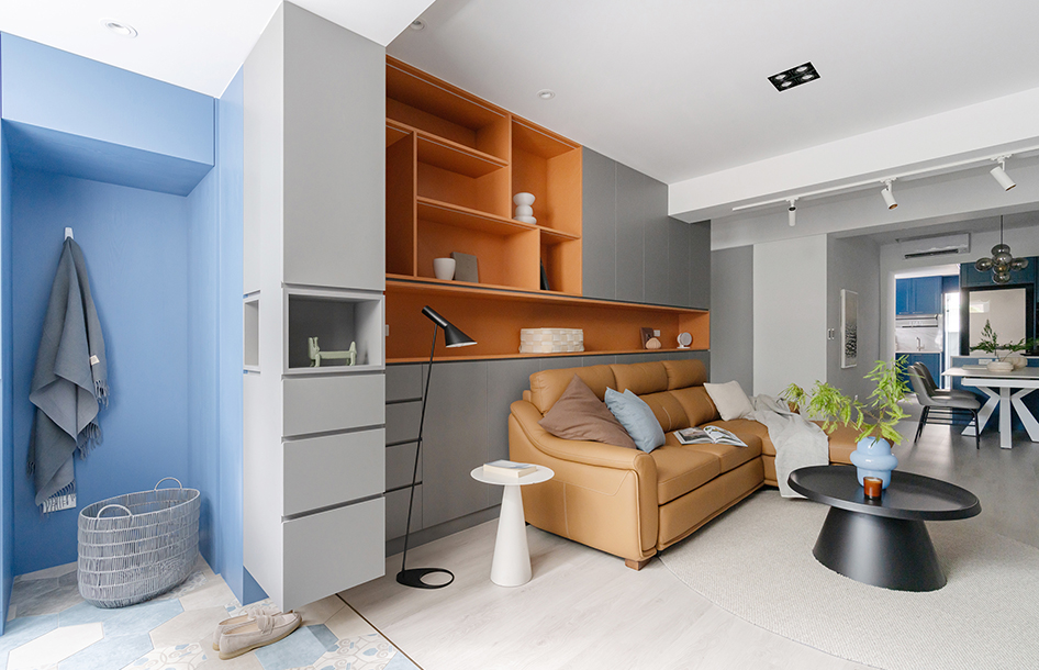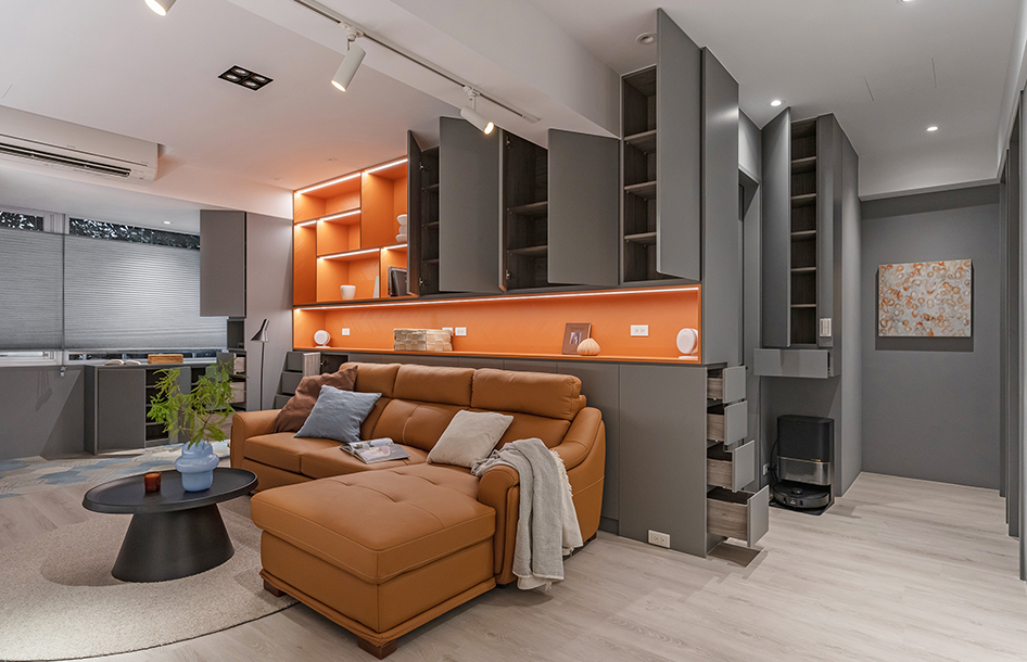 客廳、愛馬仕橘展示櫃打亮空間,